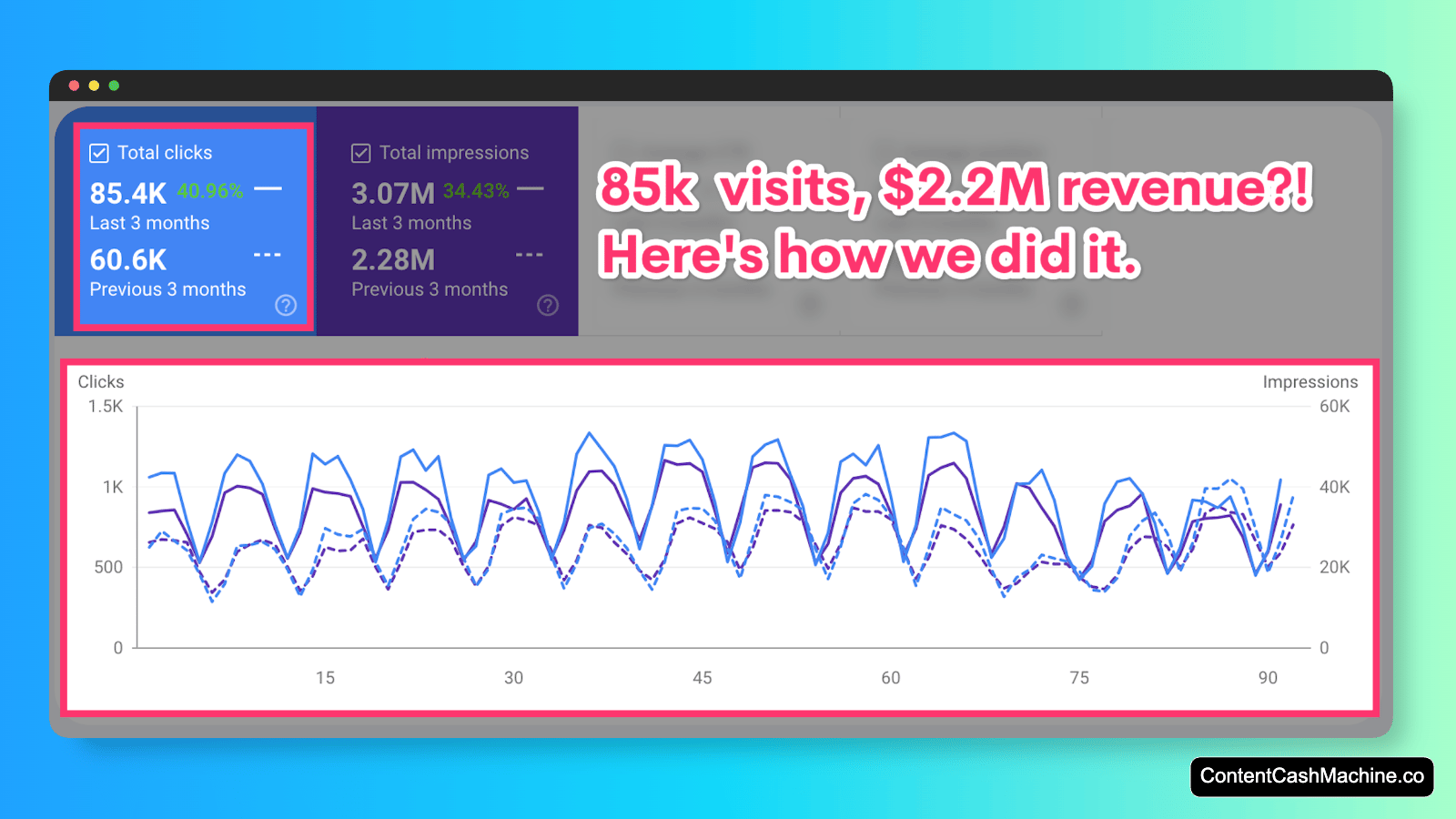 Hey Reader,In this mail, I am going to show you one simple thing: → How we went from 60,000 to 85,000 clicks in 3 months making $2.2M in revenue. While AI spammers were stressing about the March Google updates I was sipping cocktails by the beach. Ok not really — I had a nasty parasite and felt awful. Had to stay in bed for 2 weeks. Yet my client’s traffic increased by +40%! And they made $2.2M from that traffic. Just from organic content! Because my awesome team delivered on our strategy.The...